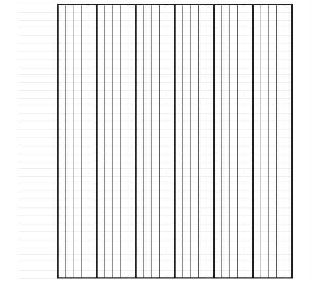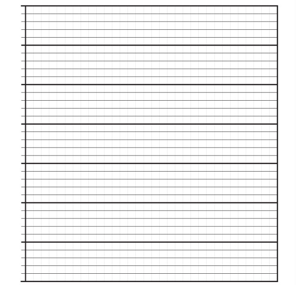 Side 2 (Horizontal Bar Graphs)contains a grid with 31 vertical lines and 36 horizontal lines. Every fifth vertical line is bold, in order to facilitate horizontal scaling. The horizontal lines are light and can be used as guide lines to help place and draw the bars. The grid is also offset to the right to allow for the labeling of the horizontal bars. The grid is 33.5” by 39”.